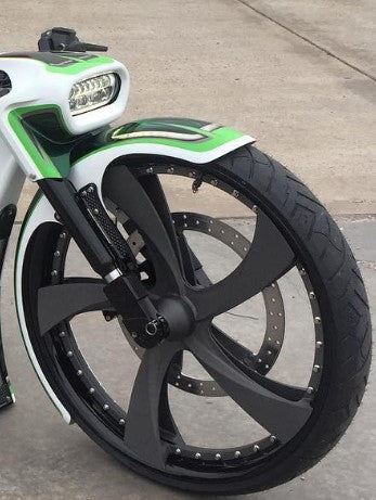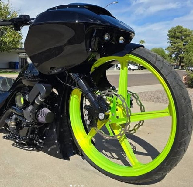 A set of SIX-Y 21x3.25 and 18x5.5 Hybrid Wheels, carefully designed and crafted exclusively for Woodlawn Performance Bagger to complement their Hybrid Performance Bagger builds.