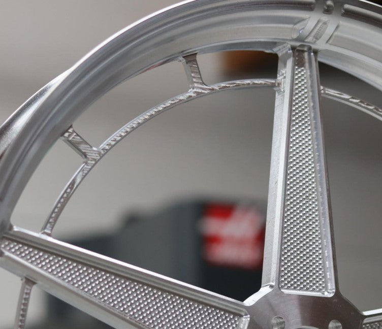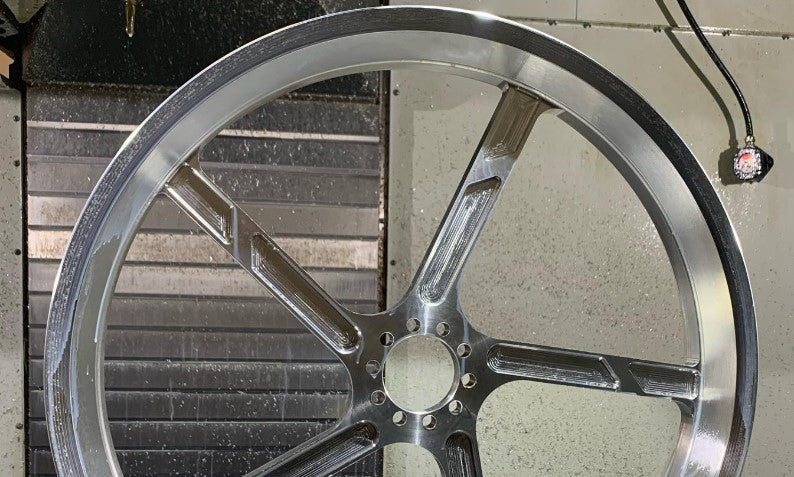 A set of five-spoke 21x3.25 and 18x5.5 Hybrid Wheels, carefully designed and crafted exclusively for Woodlawn Performance Bagger to complement their Hybrid Performance Bagger builds.